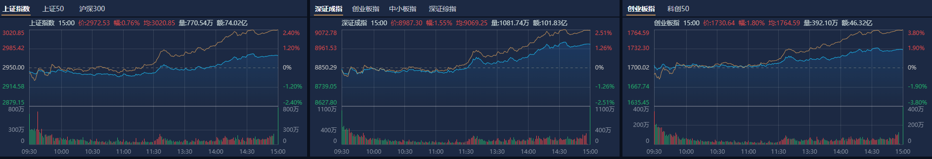 市场全天震荡反弹,创业板指领涨。截至收盘,沪指涨0.76%,深成指涨1.55%,创业板指涨1.8%。总体上个股涨多跌少,全市场超4800只个股上涨。