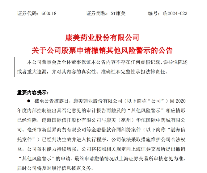 6月26日,ST康美(600518.SH)发布关于公司股票申请撤销其他风险警示的公告。