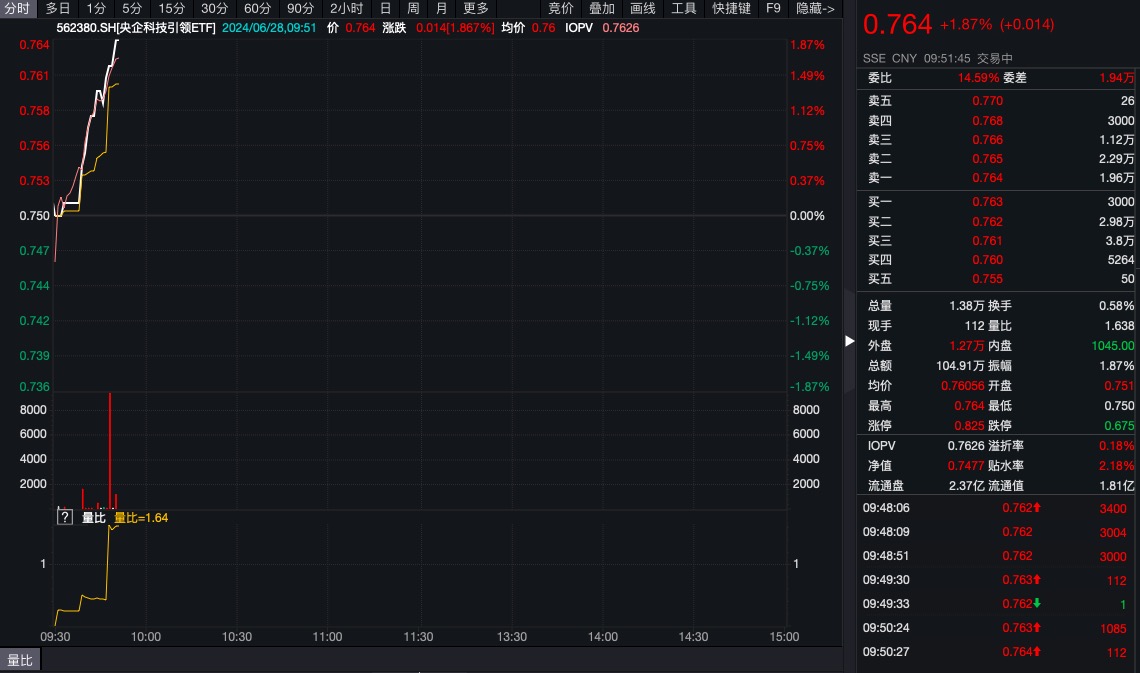 相关ETF中,央企科技引领ETF(562380)大幅走强,现涨1.87%,成交额超100万元,换手率0.58%,溢折率0.22%,盘中频现溢价交易。