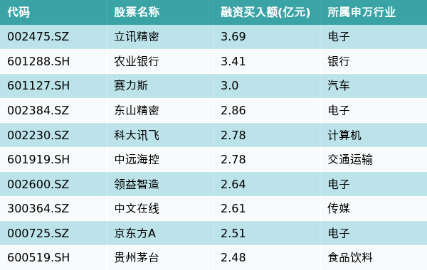 6月27日,两市共有3308只个股有融资资金买入,其中立讯精密、农业银行、赛力斯排名前三,买入金额分别3.69亿元、3.41亿元、3.0亿元。融资买入额前10个股详情见下表: