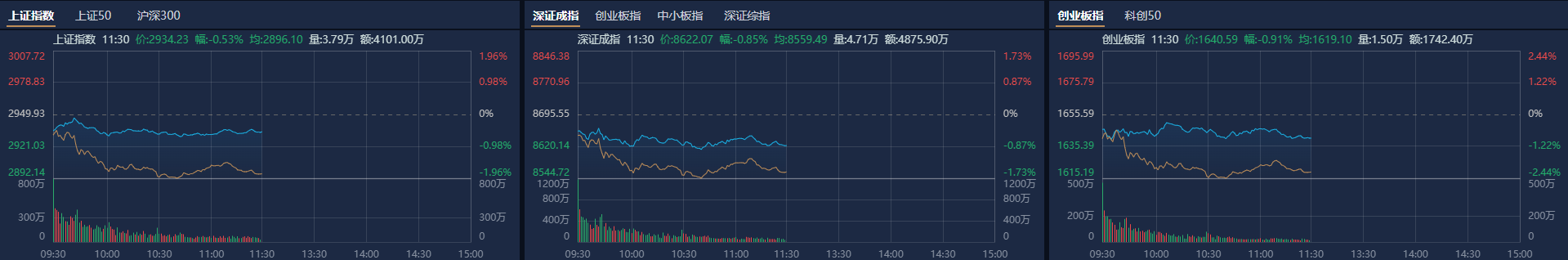 市场早盘震荡调整,创业板指领跌。南财金融终端显示,截至早间收盘,沪指跌0.53%,深成指跌0.85%,创业板指跌0.91%。总体上个股跌多涨少,全市场超4600只个股下跌。