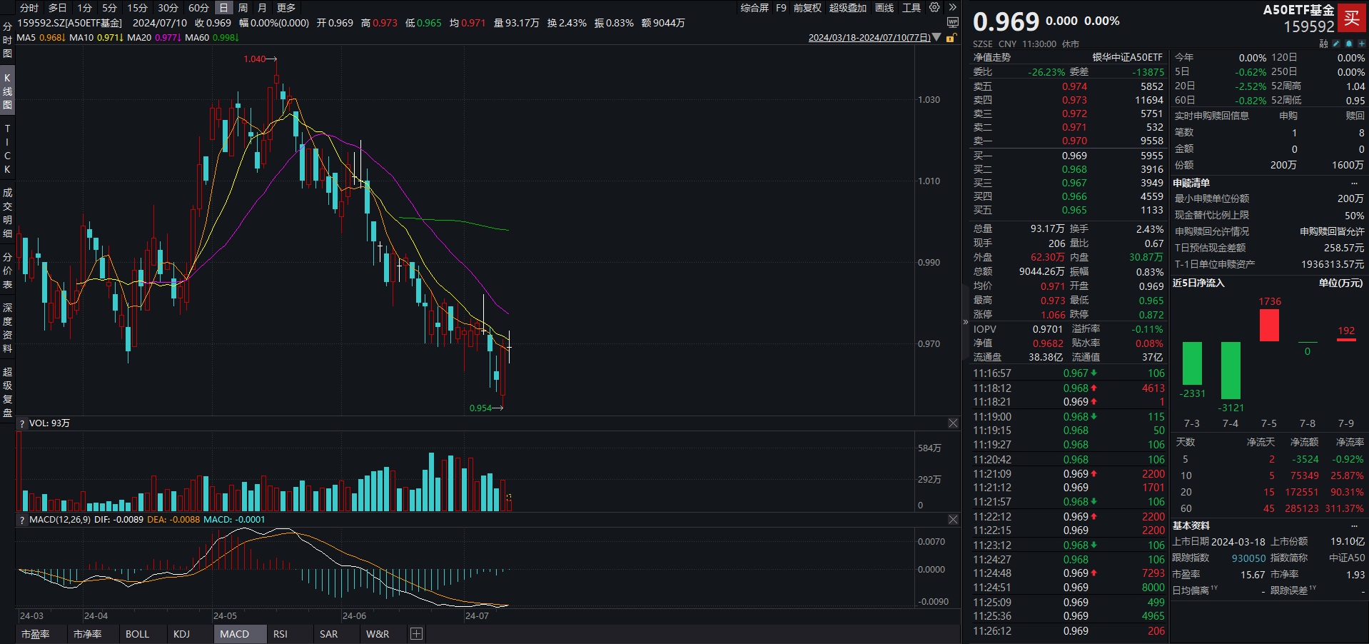 Wind数据显示,截至昨日收盘,A50ETF基金(159592)最新流通份额超38亿份,最新规模为37.16亿元。