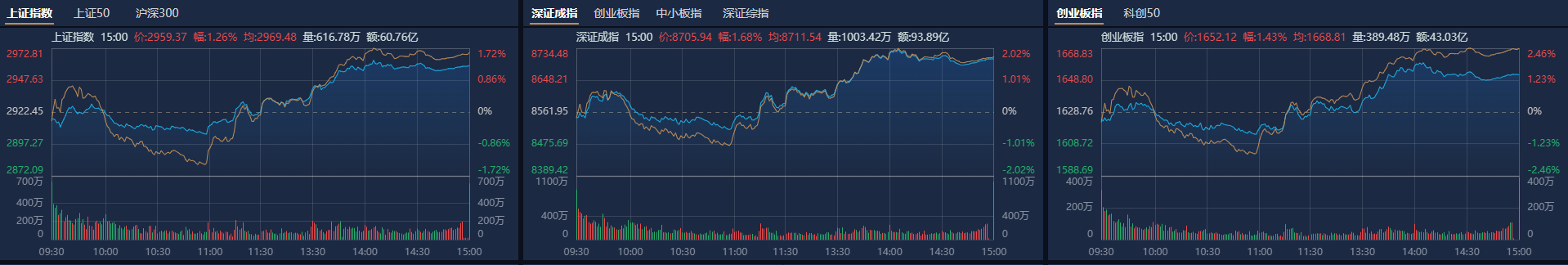 市场全天低开高走,三大指数均涨超1%。南财金融终端显示,截至收盘,沪指涨1.26%,深成指涨1.68%,创业板指涨1.43%。