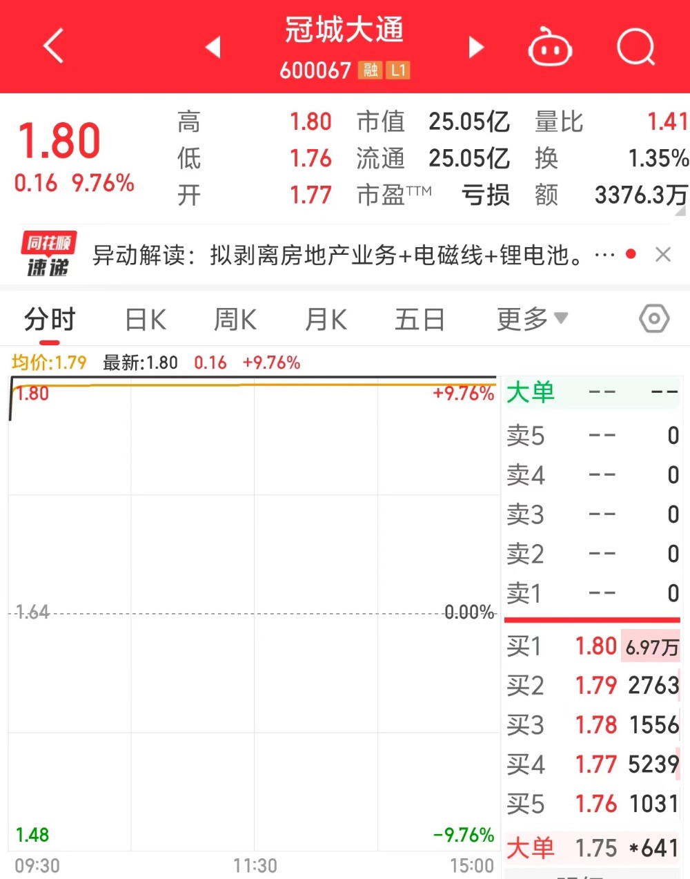 7月11日,冠城大通(600067.SH)股价一字涨停,报1.80元/股。消息面上,冠城大通昨晚发布公告称,公司拟转让房地产开发业务,实现产业彻底转型。