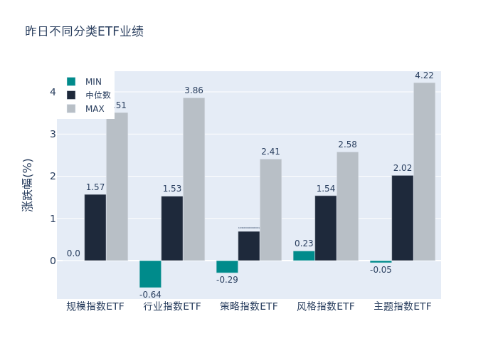 昨日股票型ETF收益率中位数为1.77%。其中按照不同分类,规模指数中华夏中证2000ETF收益率最高,为3.51%;行业指数中国泰中证有色金属矿业主题ETF收益率最高,为3.86%;策略指数中质量ETF收益率最高,为2.41%;风格指数中浙商之江凤凰ETF收益率最高,为2.58%;主题指数中稀有金属ETF基金收益率最高,为4.22%。