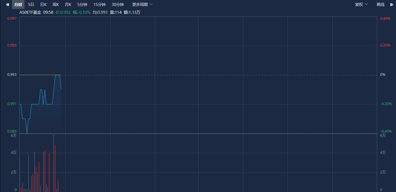 ETF方面,A50ETF基金(159592)开盘震荡走低,一度下跌0.40%,随后跌幅收窄,截至发稿下跌0.10%,成交额超5000万元,换手率超1%,早盘交投活跃。