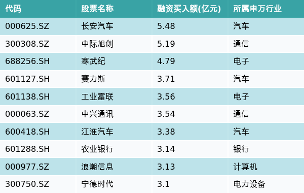 7月18日,两市共有3351只个股有融资资金买入,其中长安汽车、中际旭创、寒武纪排名前三,买入金额分别5.48亿元、5.19亿元、4.79亿元。融资买入额前10个股详情见下表: