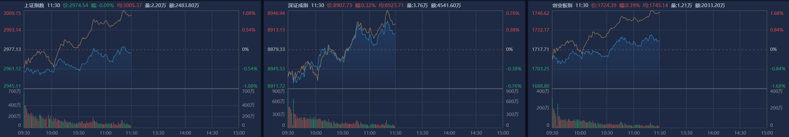 市场早盘震荡反弹,三大指数涨跌不一,科创50指数涨近2%。南财金融终端显示,截至早间收盘,沪指跌0.08%,深成指涨0.32%,创业板指涨0.39%。总体上个股涨多跌少,全市场超3600只个股上涨。