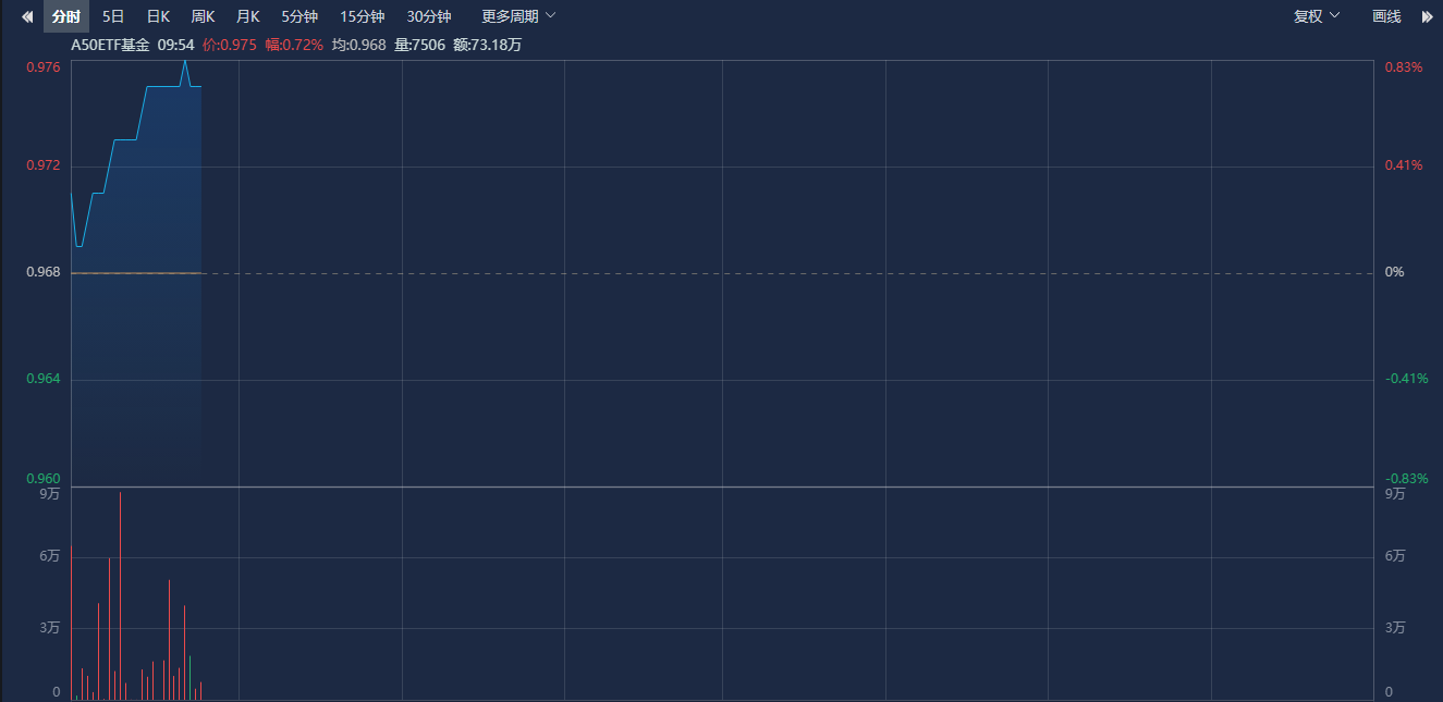 ETF方面,A50ETF基金(159592)开盘后持续走强,截至发稿上涨0.72%,成交额超4000万元,换手率超1%,盘中交投活跃。资金流向方面,该ETF连续3日获资金净流入,累计净流入额超1.8亿元。