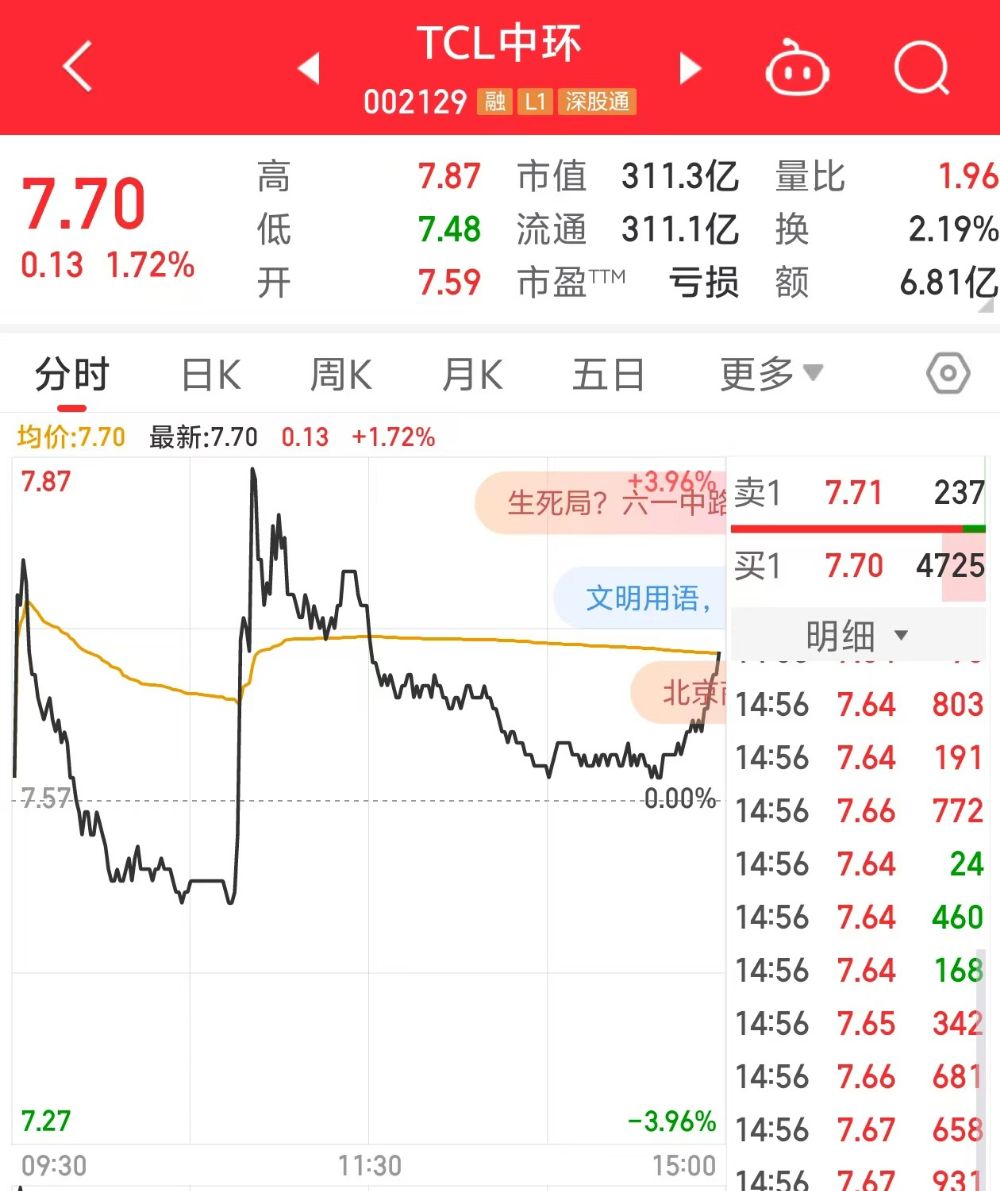 今日,TCL中环收涨1.72%,报7.70元/股。