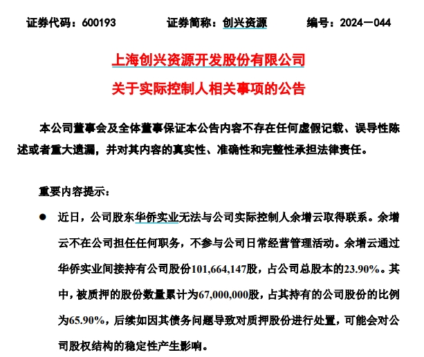 9月9日,创兴资源(600193.SZ)盘后发布公告称,收到股东浙江华侨实业有限公司(简称“华侨实业”)出具的告知函。近日,华侨实业无法与公司实际控制人余增云取得联系。