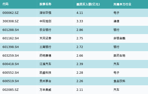 9月10日,两市共有3357只个股有融资资金买入,其中深圳华强、中际旭创、农业银行排名前三,买入金额分别4.11亿元、3.33亿元、2.86亿元。融资买入额前10个股详情见下表: