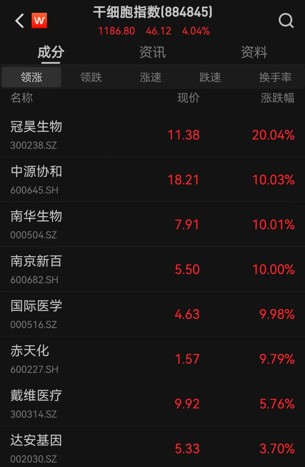 9月9日,干细胞指数收涨4.04%,冠昊生物(300238.SZ)20CM涨停,南华生物(000504.SZ)10CM涨停。
