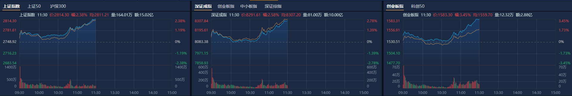 A股午评:沪指半日涨2.38%收复2800点,大金融股全线爆发