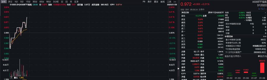 相关ETF方面,A500ETF指数(512020)早盘拉升翻红,截至发稿涨0.31%,成交额超9000万元,换手率1.94%,盘中交投活跃,溢折率0.06%,盘中频现溢价交易。