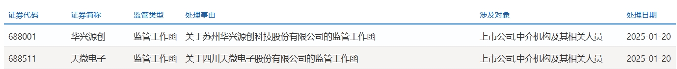 1月20日,华兴源创(688001.SH)、天微电子(688511.SH)收到上交所下发的监管工作函。