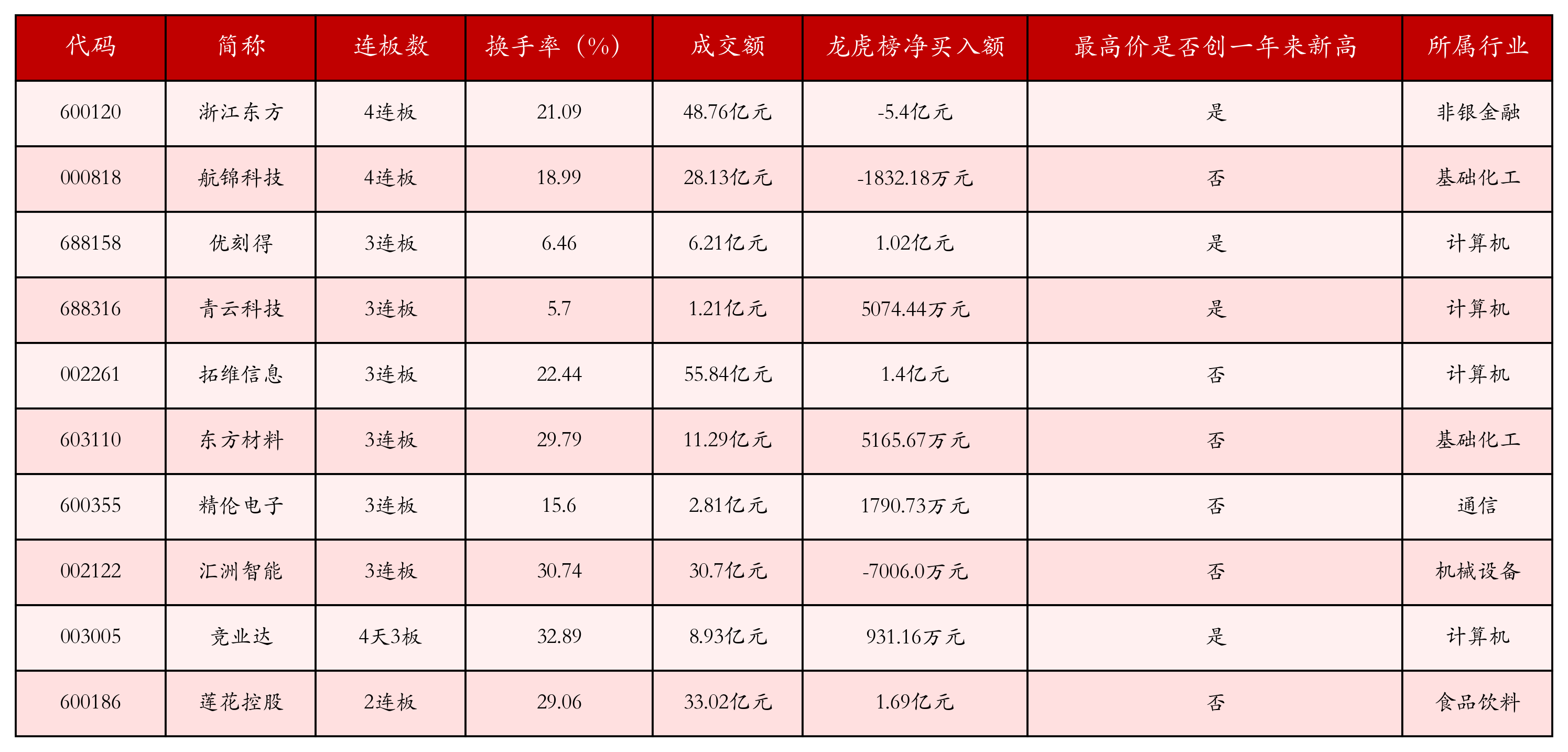 截至2月7日收盘,上证综指上涨1.01%,收于3303.67点,深证成指上涨1.75%,收于10576.0点,创业板指上涨2.53%,收于2174.35点。今日沪深两市A股共计89只涨停,综合当前连板数以及当日龙虎榜数据,其中较为强势的前三只个股分别为:浙江东方(600120)、航锦科技(000818)与优刻得(688158)。今日强势个股前10位具体数据见下表: