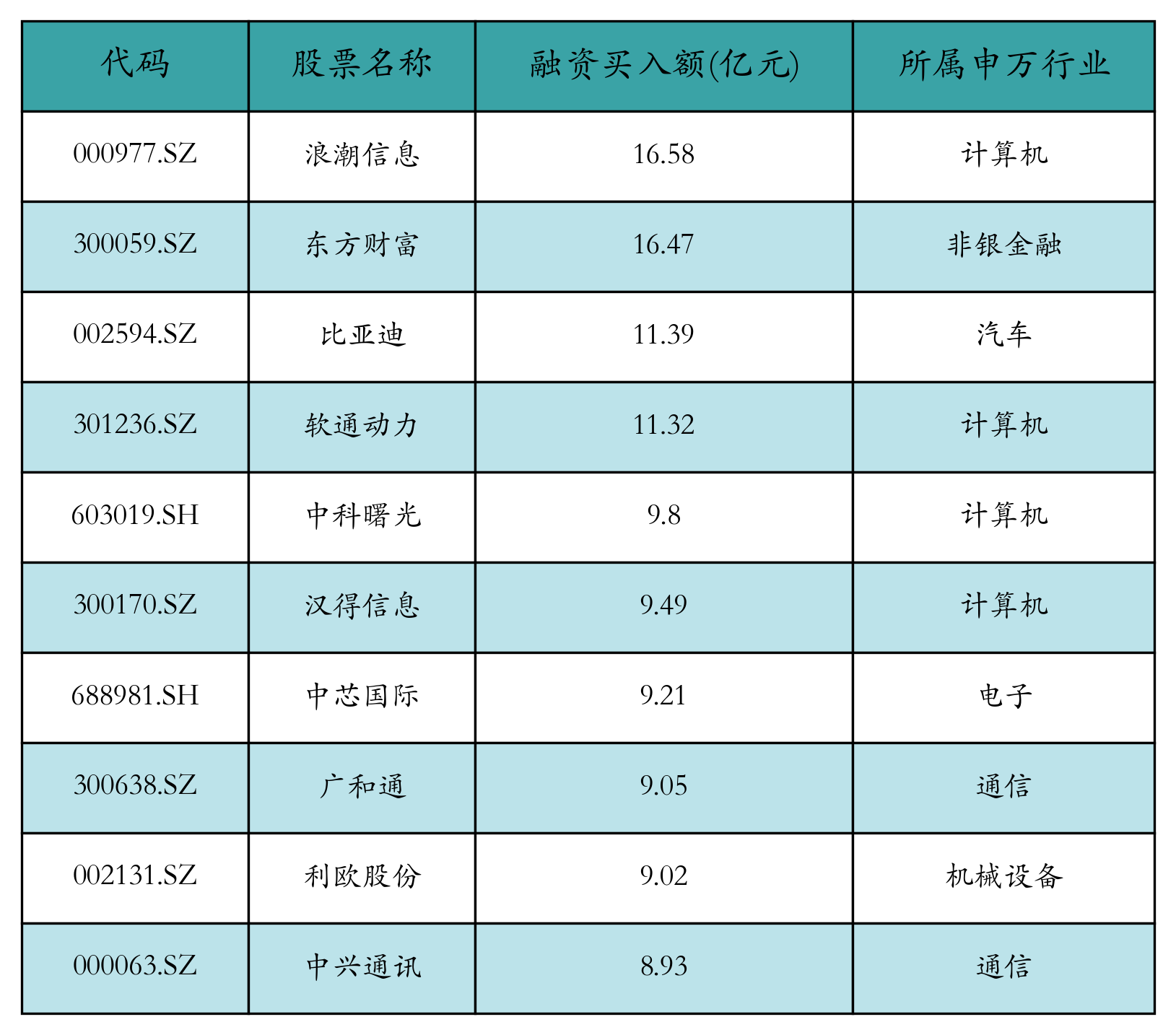 两市共有3400只个股有融资资金买入,其中浪潮信息、东方财富、比亚迪排名前三,买入金额分别为16.58亿元、16.47亿元、11.39亿元。融资买入额前10个股详情见下表: