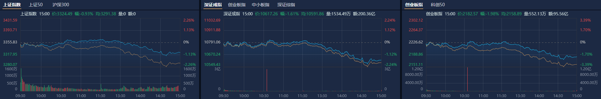 市场午后持续走低,创业板指领跌。南财金融终端显示,截至收盘,沪指跌0.93%,深成指跌1.61%,创业板指跌1.98%。
