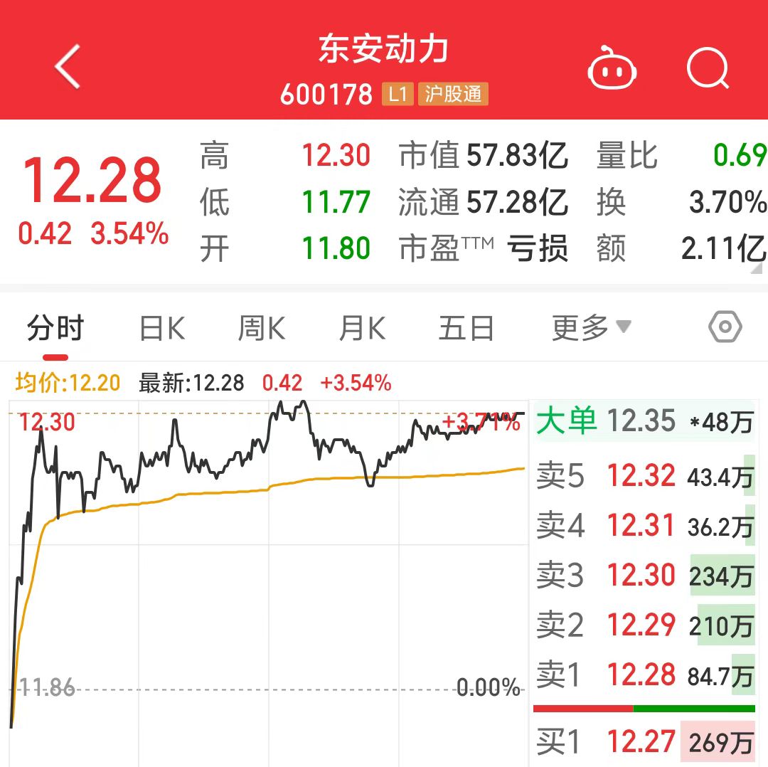 截至2月19日收盘,东安动力涨3.54%,报12.28元/股,总市值57.83亿元。