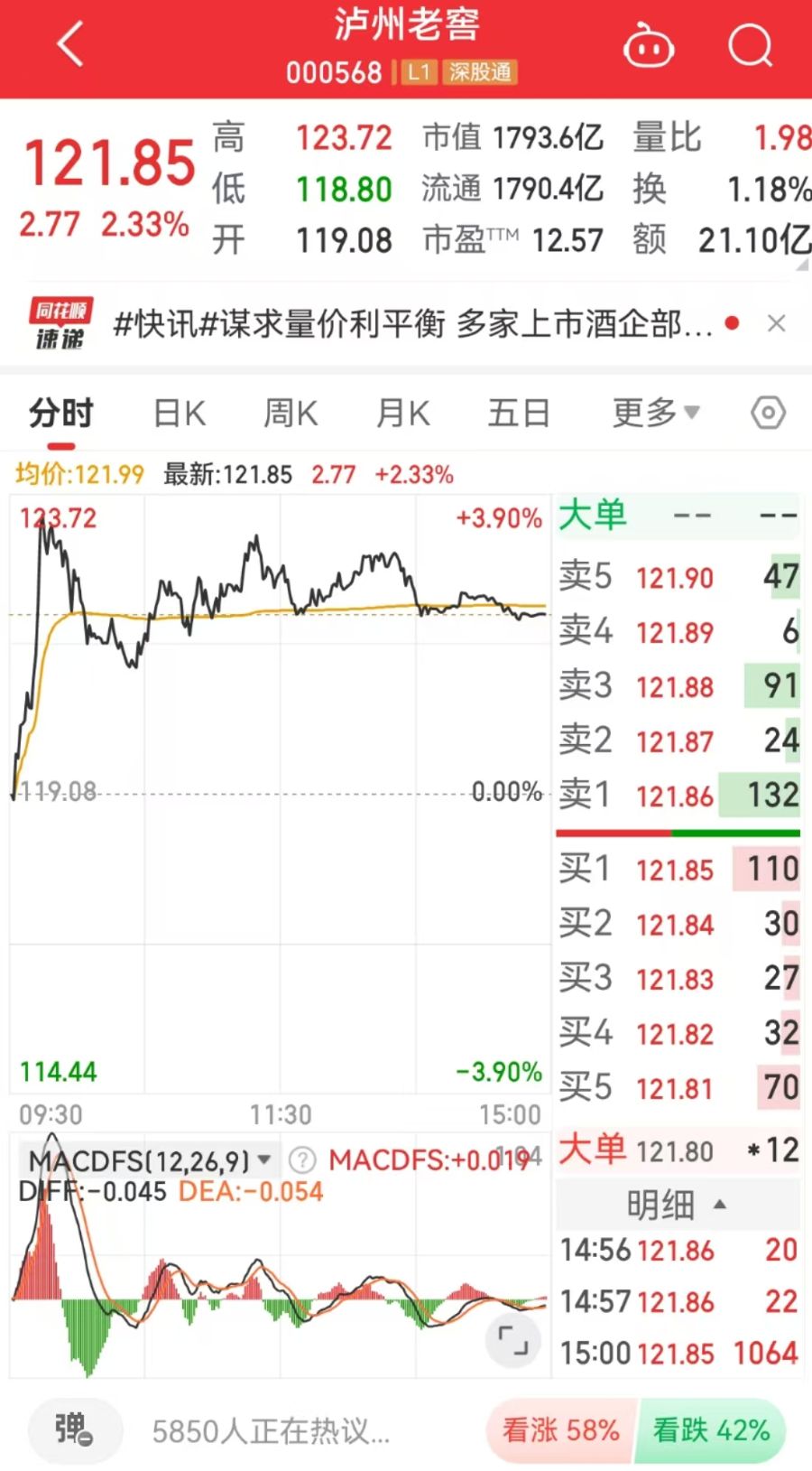 二级市场上,截至2月24日收盘,泸州老窖上涨2.33%,报121.85元/股,总市值1793.6亿元。