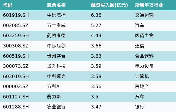 5月9日,两市共有3302只个股有融资资金买入,其中中远海控、万丰奥威、药明康德排名前三,买入金额分别6.36亿元、5.27亿元、4.43亿元。融资买入额前10个股详情见下表: