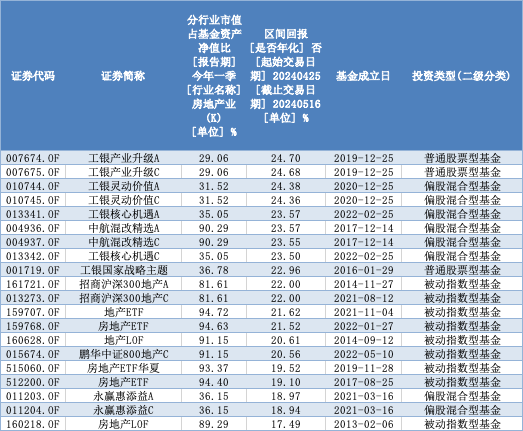 34只基金中有10只为被动指数型基金,它们跟踪的指数包括沪深300地产等权重指数、中证800地产指数、国证地产指数、中证全指房地产指数等。4月25日-5月16日,这些基金的平均区间回报达20.19%。