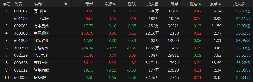 个股方面,万科A成交额56.32亿元,工业富联、万丰奥威成交额均在40亿元之上。