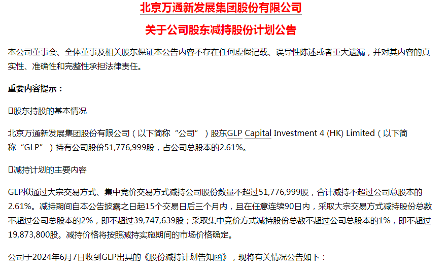 6月7日,万通发展(600246.SH,原万通地产)公告称,股东GLP拟减持不超过公司总股本2.61%的股份,而目前GLP的持股比例恰为2.61%。这意味着,股东GLP即将“清仓式”离场。
