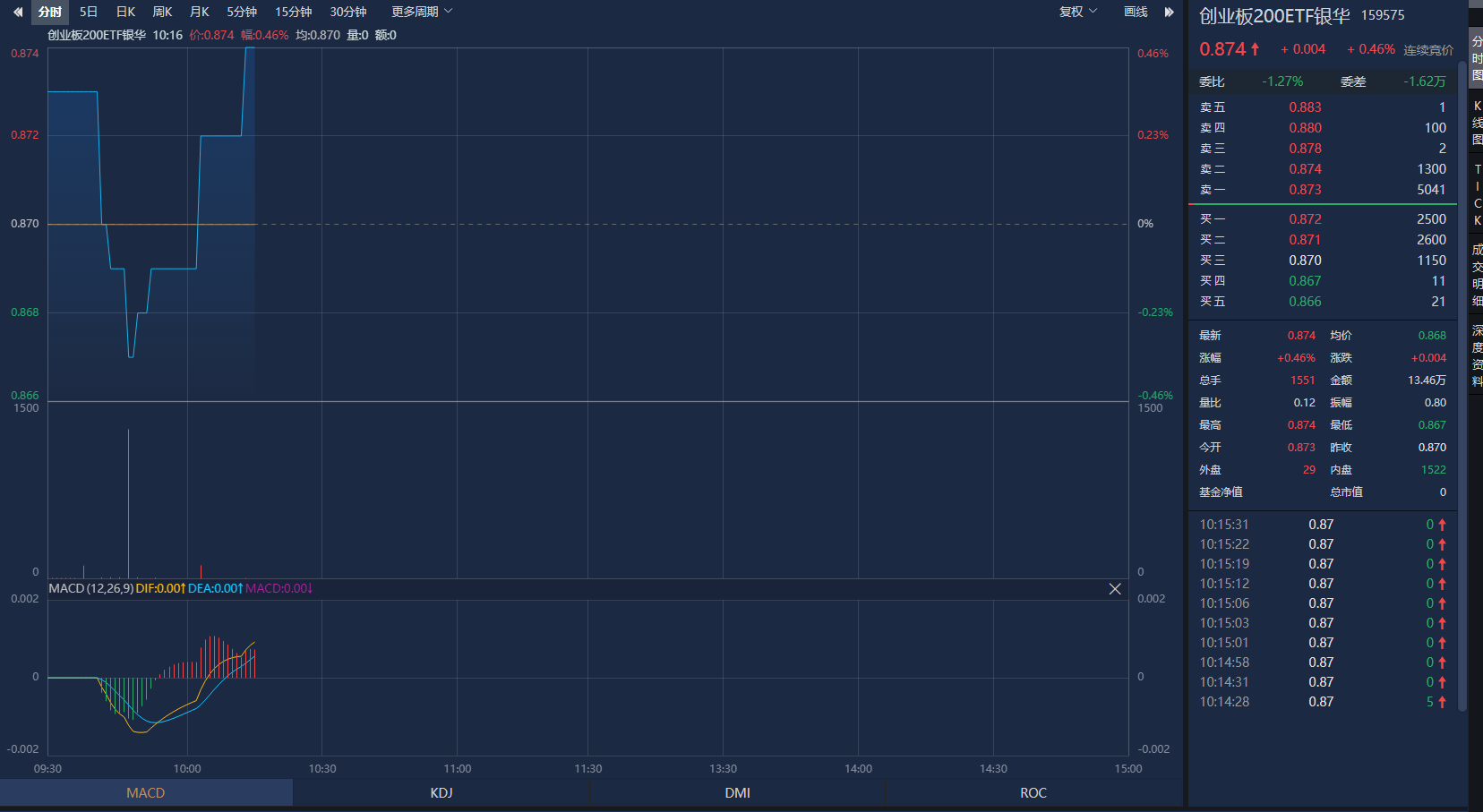 相关ETF方面,创业板200ETF银华(159575)现涨0.46%,盘中频现溢价交易,溢折率0.3%,换手率为0.41%。