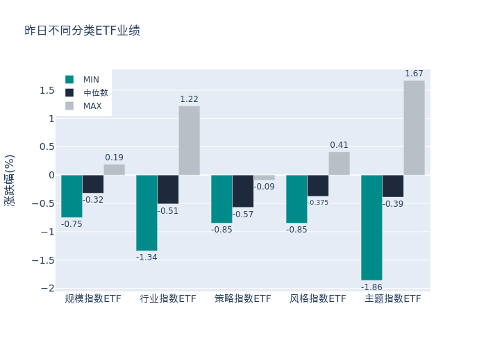 昨日股票型ETF收益率中位数为-0.35%。其中按照不同分类,规模指数中华夏中小企业100ETF收益率最高,为0.19%;行业指数中国泰中证有色金属矿业主题ETF收益率最高,为1.22%;策略指数中华夏中证红利质量ETF收益率最高,为-0.09%;风格指数中易方达上证科创板成长ETF收益率最高,为0.41%;主题指数中黄金股ETF收益率最高,为1.67%。
