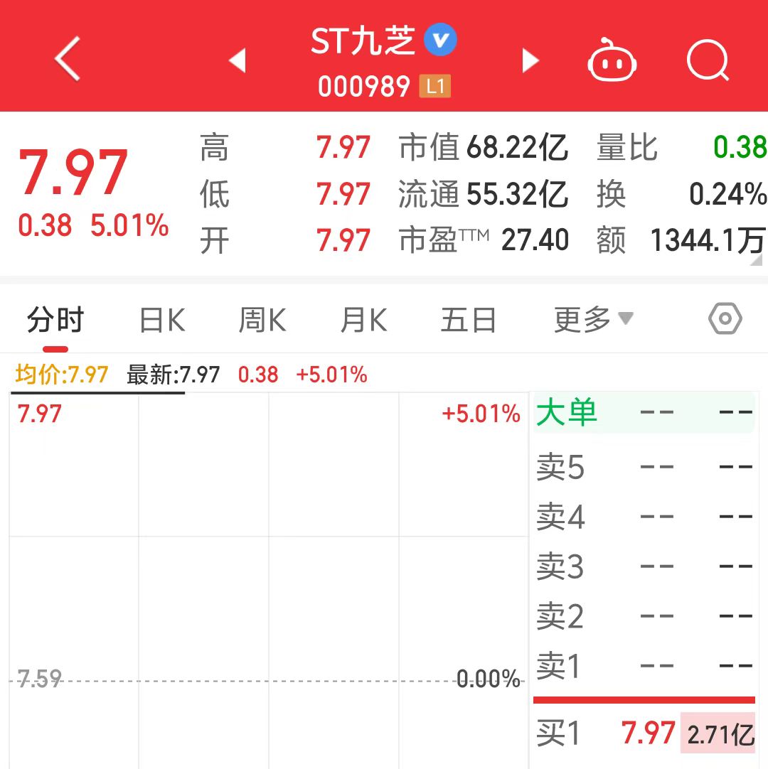 11月12日,ST九芝(九芝堂,000989.SZ)开盘一字涨停,报7.97元/股,涨幅为5.01%,总市值68.22亿元。