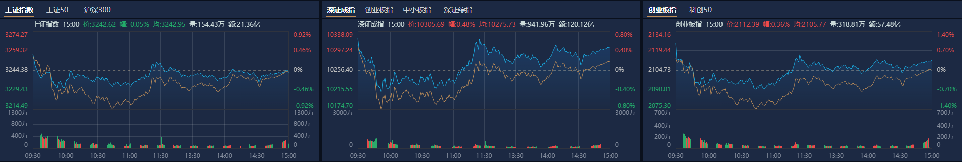 市场全天高开后震荡回落,三大指数涨跌不一。截至收盘,沪指跌0.05%,深成指涨0.48%,创业板指涨0.36%。
