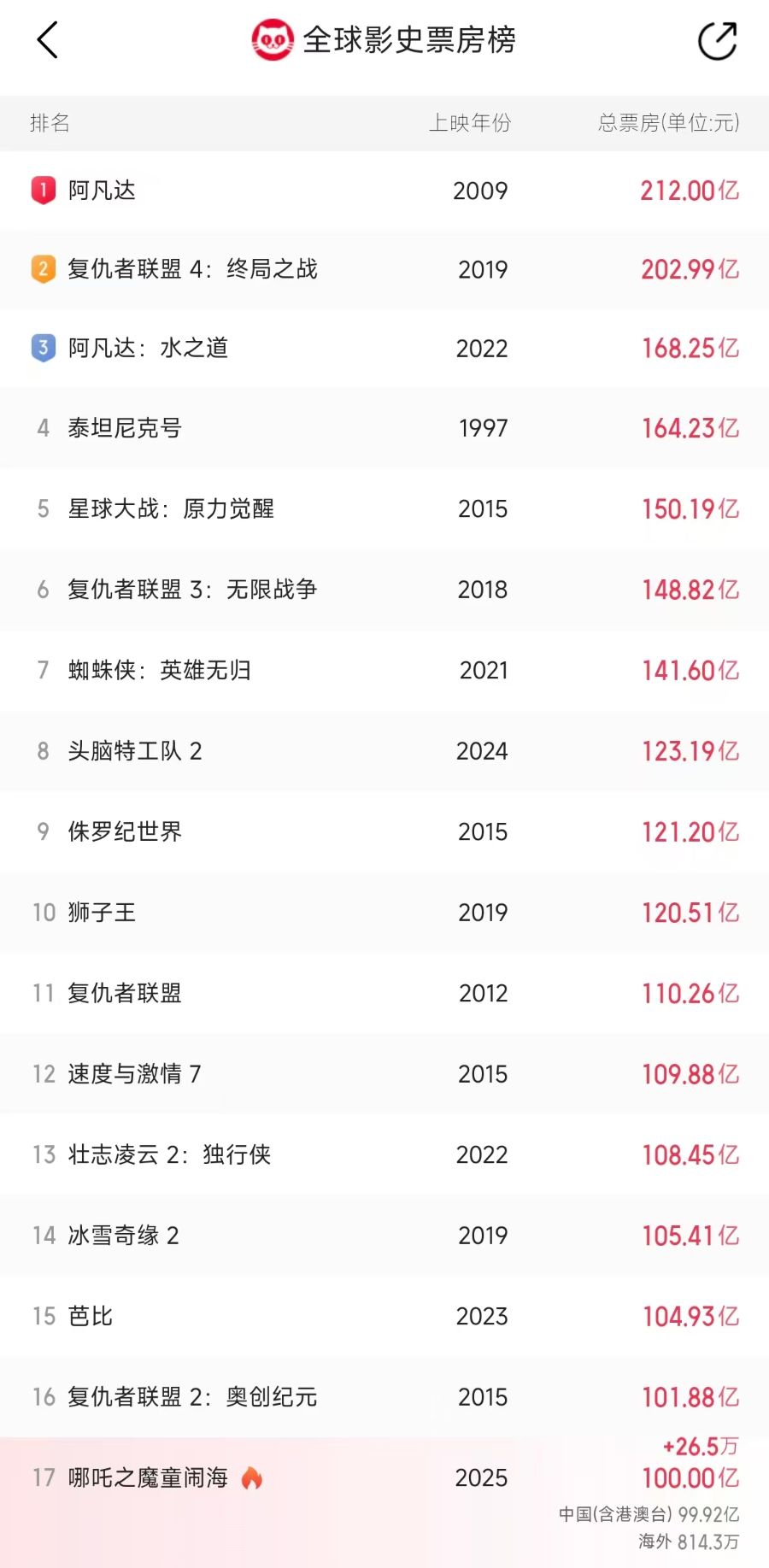 票房破100亿元,《哪吒2》挺进全球影史前17名!光线传媒或狂揽20亿元营收