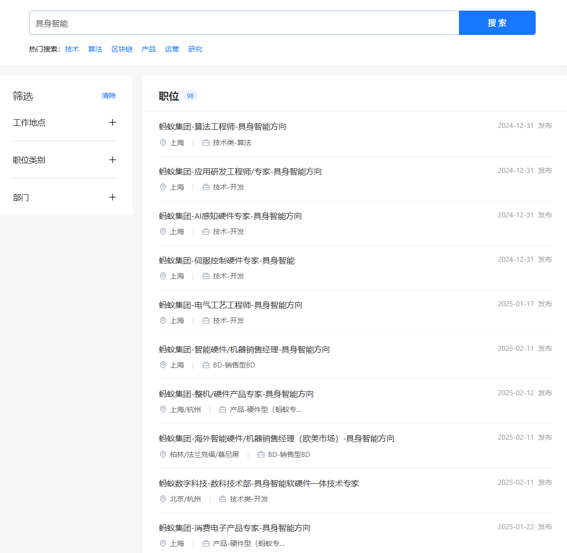 消息面上,蚂蚁集团招聘官网显示,去年12月至今年2月,该公司开放多个具身智能方向岗位,包括算法工程师、研发工程师、AI感知硬件专家、整机/硬件产品专家等岗位。
