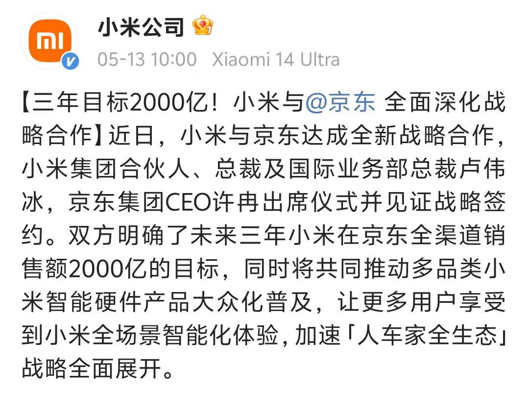 5月13日,小米与京东近日达成战略合作,双方明确了未来三年小米在京东全渠道销售额2000亿的目标。