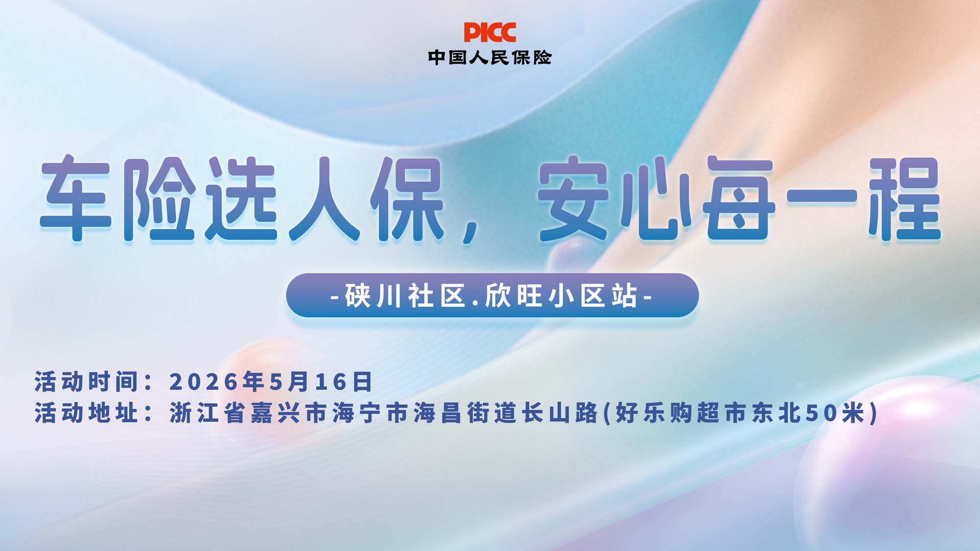 2026年5月16日,中国人民财产保险股份有限公司嘉兴市海宁支公司将走进硖川社区.欣旺小区,开展“车险选人保,安心每一程”专项活动。资深顾问现场免费答疑,细致讲解车险知识、测算续保金额、明确保障内容,根据不同用车需求定制合理方案,让投保更清晰、用车更放心。