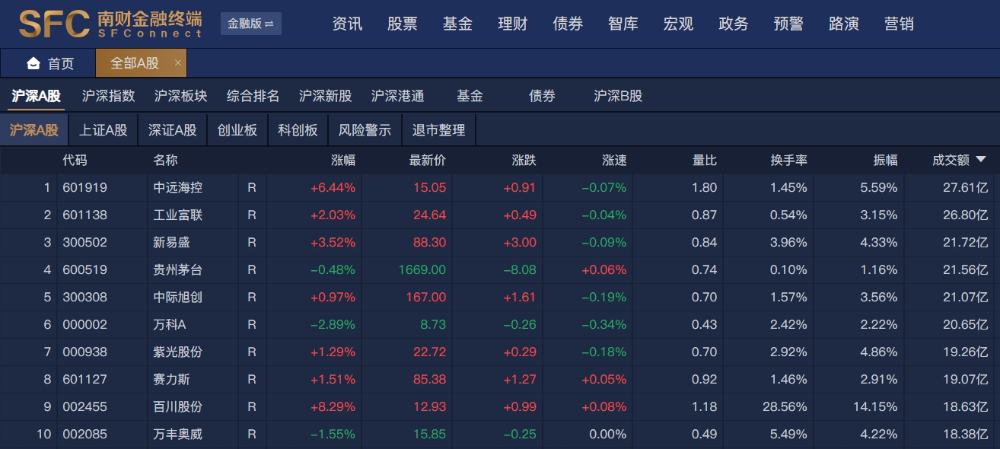 沪深两市半日成交额4781亿,较上个交易日同期放量75亿。南财金融终端显示,个股方面,中远海控半日成交额27.61亿元居首,工业富联、新易盛、贵州茅台、中际旭创、万科A成交额均超20亿元。
