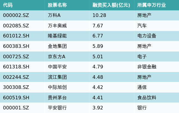 5月22日,两市共有3304只个股有融资资金买入,其中万科A、万丰奥威、隆基绿能排名前三,买入金额分别10.28亿元、7.67亿元、6.77亿元。融资买入额前10个股详情见下表: