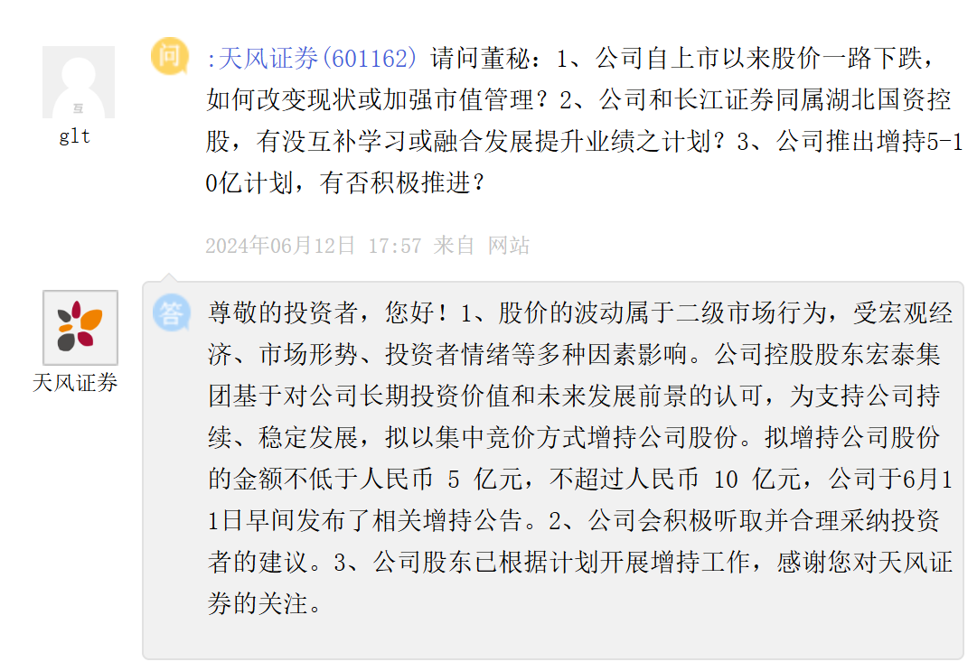 值得注意的是,近期有投资者向天风证券提问,“公司和长江证券同属湖北国资控股,有没有互补学习或融合发展提升业绩之计划?”对此,天风证券方面6月14日回复称,“公司会积极听取并合理采纳投资者的建议。”